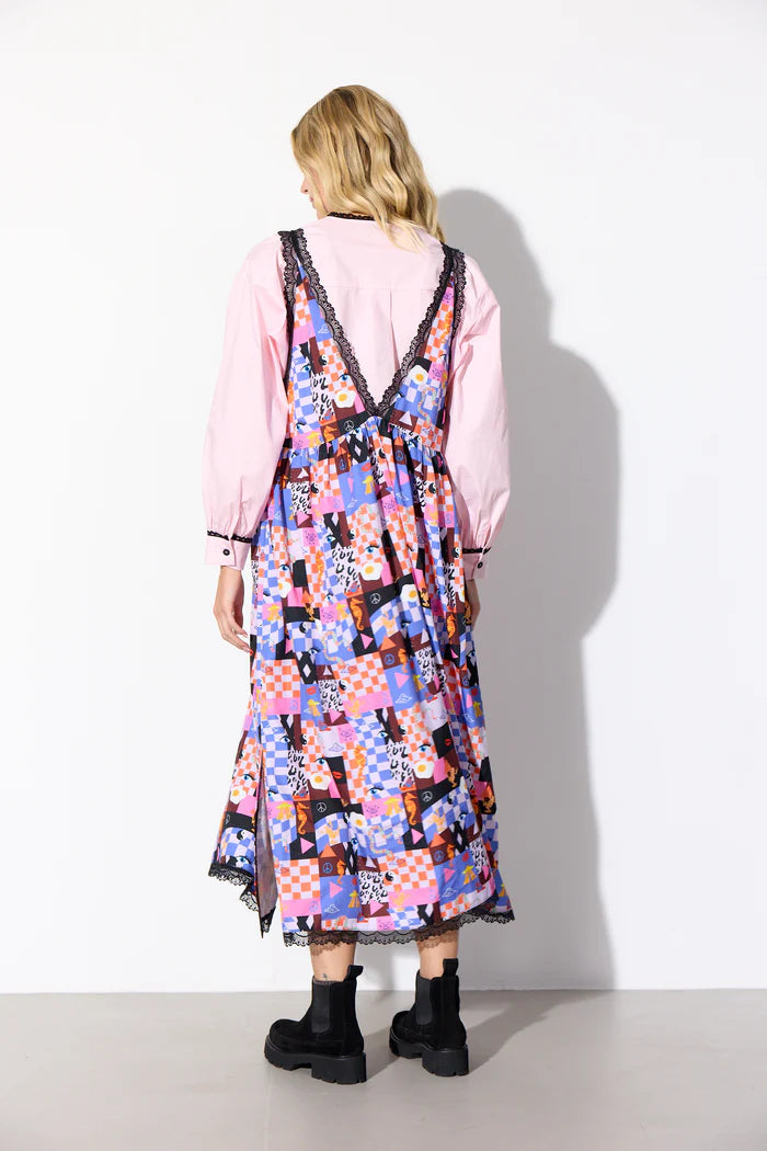 Hunkøn Ellen dress, i vores "Multiverse Art Print", er en afslappet A-line kjole med en dyb udskæring både foran og bagpå, som er detaljeret med bløde blondekanter.