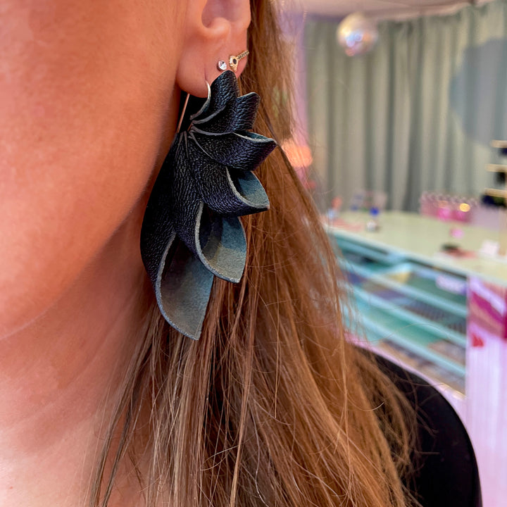 Pair of weightless earrings handmade from genuine leather. Designed and produced by the Nordic design brand, ByFossdal in Copenhagen.
