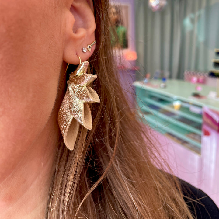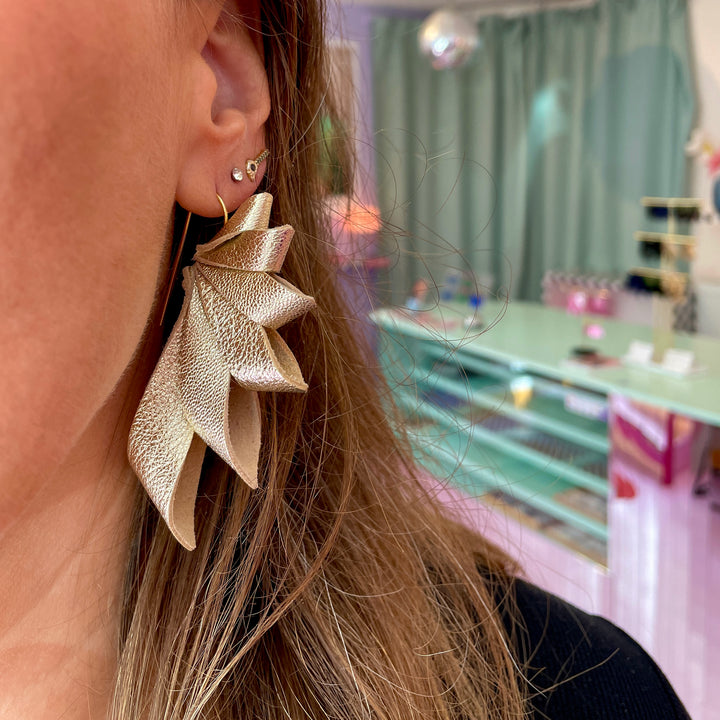 Pair of weightless earrings handmade from genuine leather. Designed and produced by the Nordic design brand, ByFossdal in Copenhagen.