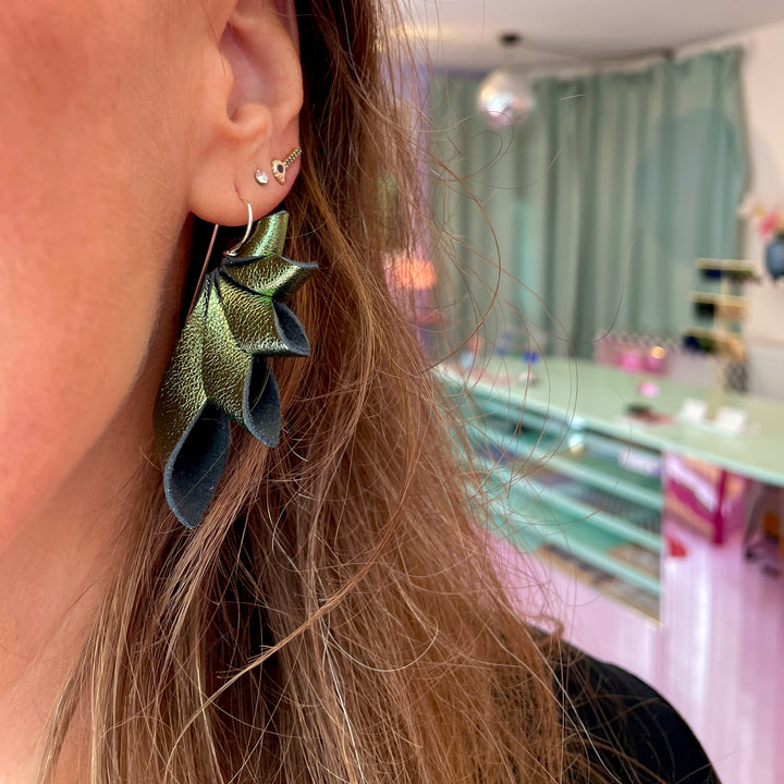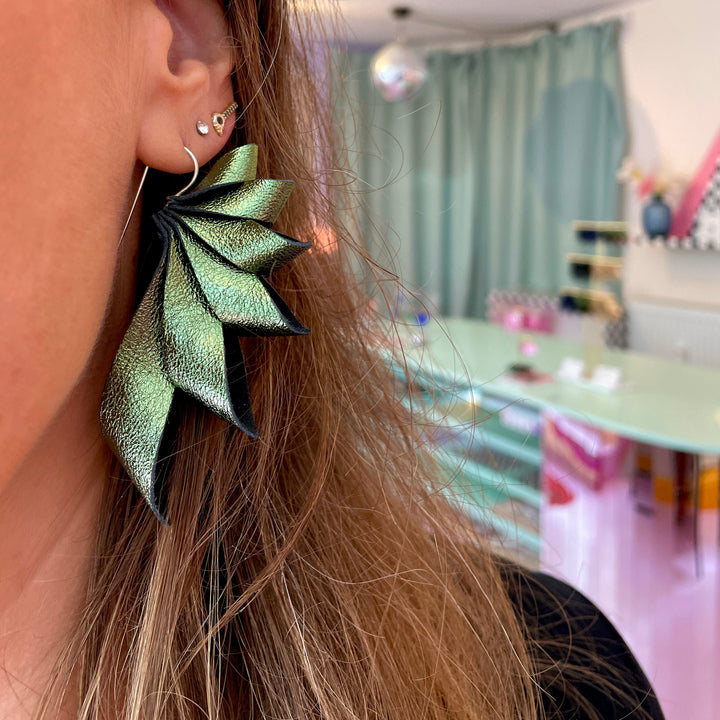 Pair of weightless earrings handmade from genuine leather. Designed and produced by the Nordic design brand, ByFossdal in Copenhagen.