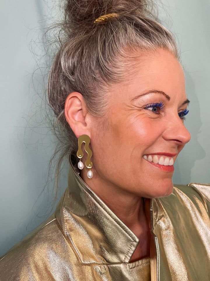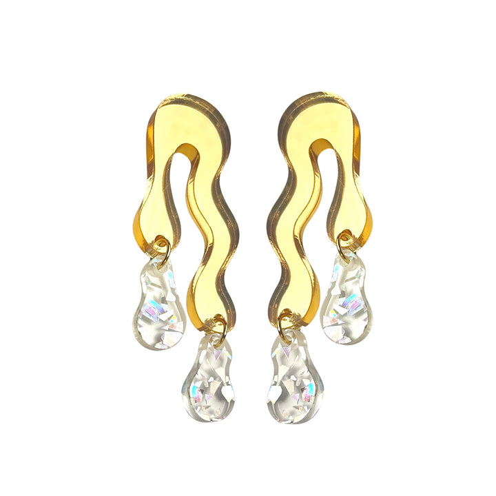 Beautiful holographic drops, dripping from a golden double drop with earstud.