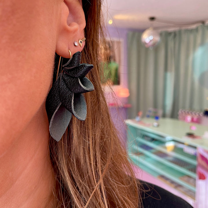 Pair of weightless earrings handmade from genuine leather. Designed and produced by the Nordic design brand, ByFossdal in Copenhagen.