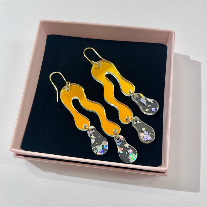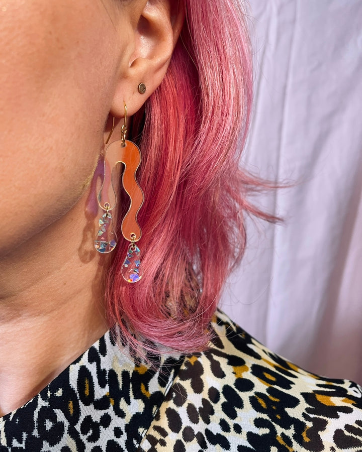 Beautiful double melted drops, with two Holo Flakes / holographic Tiny drops and earhook